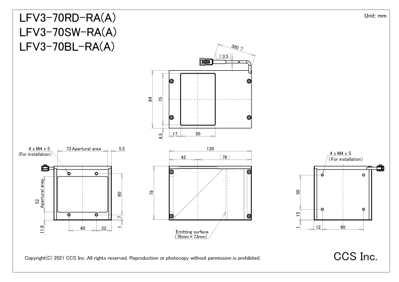84mm (W) x 120mm (D) x 78mm (H) coaxial light with a light emitting surface of 76mm x 73mm. Available colors: red (LFV3-70RD-RA(A)), white (LFV3-70SW-RA(A)), and blue (LFV3-70BL-RA(A)). 90-degree position change of a standard coaxial light illumination port.