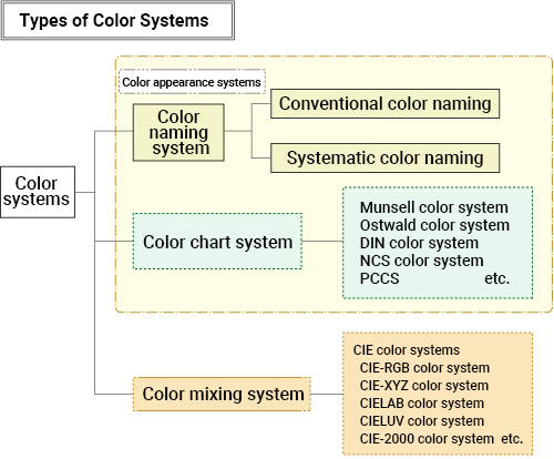 (Color naming systems and color chart systems (color order systems) are sometimes collectively called color appearance systems.)