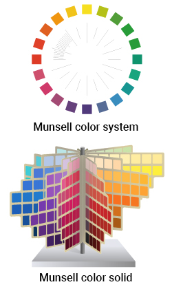 Among color charts, the most well-known is the Munsell color system. Colors are arranged three-dimensionally so that they change visually and perceptually at equal intervals of hue, value, and chroma (the three psychological attributes of color) as independent variables. It displays colors objectively by assigning symbols and numbers according to three-dimensional color arrangements. The system is simple and intuitive, and it is widely used around the world. This color chart system applies only to the object color, not the light source color. It is sometimes called the color order system, which was suggested by the International Colour Association (AIC) around 1980.