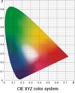 There are several CIE color systems. The most basic one is the CIE XYZ color system. The XYZ color system can display the result of additive color mixing by a straight line according to the color mixing ratio on the chromaticity diagram. This makes it useful for describing light source colors. ≪4≫