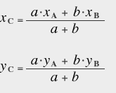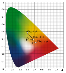 If mixing two types of colors A ( xA, yA ) and B ( xB, yB ) on the xy chromaticity diagram with the ratio of a:b results in chromaticity point C ( xC, yC ), the coordinate point is obtained by dividing AB by the ratio of b : a. That is,