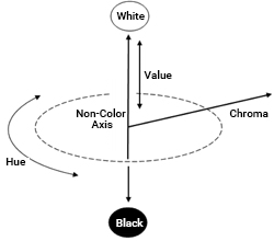 If you compare it to a globe, value corresponds to the earth's axis from the North Pole (white) to the South Pole (black). Hue corresponds to the longitude indicating the direction of rotation around the earth's axis. Chroma is the distance from the earth's axis to its surface. A cross-section of the globe sliced perpendicular to the earth's axis on the equator shows a hue circle.