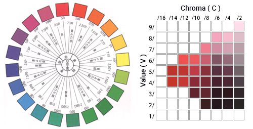 The color chart system is a simple color classification system based on the three attributes of color. They are hue, such as blue or red, value, indicating lightness, and chroma, indicating color intensity. Although the three attributes are technically interrelated, in many cases, they can be treated as independent of each other. ≪1≫ In practice, it is widely used as an intuitive way to understand color.