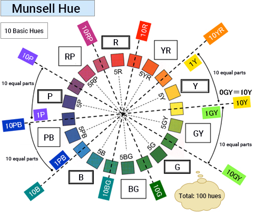 There are five principal Munsell hues: red (R), yellow (Y), green (G), blue (B), and purple (P), and five intermediate hues: yellow-red (YR), green-yellow (GY), blue-green (BG), purple-blue (PB), and red-purple (RP). Each color wheel is divided into ten equal size zones according to these basic hues.