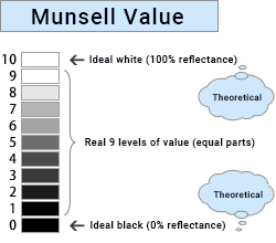 The highest Munsell value is 10, which represents an ideal white (reflection surface with 100% luminous reflectance). The Munsell value of ideal black is 0 (luminous reflectance is 0%). The vertical axis of the Munsell value is perceptually divided into 11 equal parts numbered 0 to 10 so that the feeling of brightness changes at a constant rate. ≪5≫