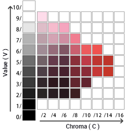For chromatic colors, the display format is HV / C. Consider a red with the notation 5R4 / 14.