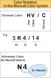 For achromatic colors, there is no concept of hue and chroma, only value, so N for neutral (achromatic) is added to the beginning of the value. For example, Munsell value 4 is N4.