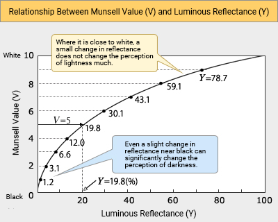 According to the Weber-Fechner law, the human senses (vision, hearing, taste, touch, and smell) are logarithmically related to the strength of the stimulus. In the case of sight, the higher the luminous reflectance of an object (Y), the more saturated the brightness perceived by the eye. The relationship between luminous reflectance (Y) and Munsell value is also logarithmic, as shown in the figure below.