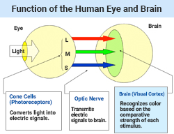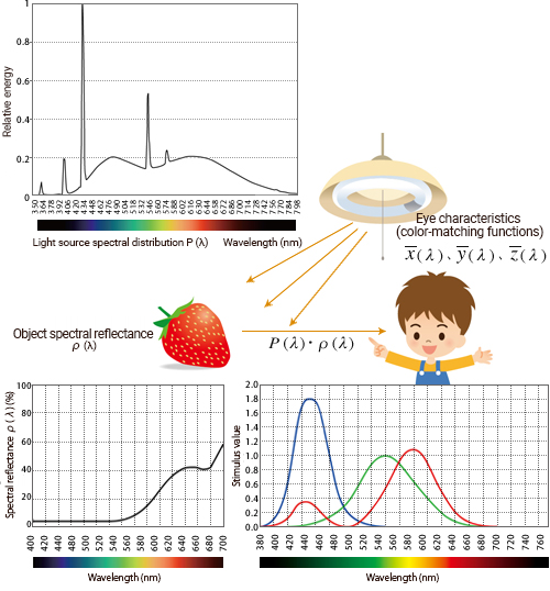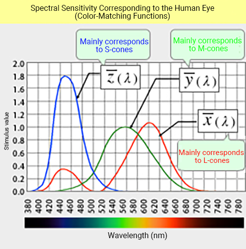 If the spectral distribution of light is P (λ) and the spectral reflectance (transmittance) of an object ≪3≫ is ρ (λ), then the spectral distribution characteristics of light incident to the eye will be the product of P (λ) ・ ρ (λ). That light stimulates the cone photoreceptor cells, and the brain recognizes color by the ratio of the amount of stimulation. The color-matching functions x (λ), y (λ), and z (λ) are mathematically manipulated based on the wavelength sensitivity (spectral sensitivity) of cone cells.≪4≫