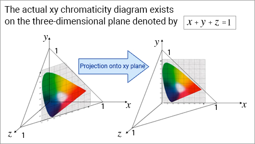 As described above, in the XYZ color system, x + y + z = 1 always holds for any color (regardless of where the chromaticity point is located within the horseshoe shape on the xy chromaticity diagram). Algebraically, it shows the equation of a plane with intercept 1 on each axis in a three-dimensional coordinate space consisting of the x-axis, y-axis, and z-axis. Although the xy chromaticity diagram exists on a three-dimensional plane, it is not intuitive for people to think of a three-dimensional space in their heads. By projecting the chromaticity diagram onto the x-y plane, it becomes easier to visualize in your head, which is why it is displayed on a 2D plane.