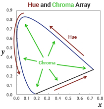 The farther away from the achromatic area centered on (x, y) = (0.333, 0.333), the higher the chroma. The highest chroma for each hue is located along the spectral locus and the line of purples.
