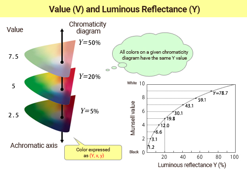 This is known as the CIE xyY color system. You can refer to Comment ≪5≫ in the previous section, which explains how the Munsell value has a logarithmic relationship with luminous reflectance Y.
