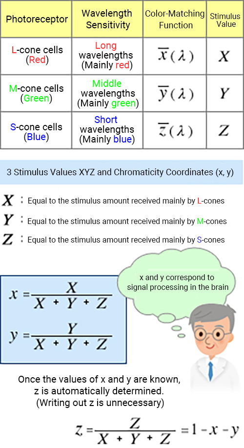 The brain recognizes colors by the ratio of these stimulus values. The chromaticity value (x, y) above is defined according to the brain's recognition.