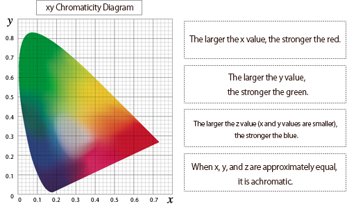 The CIE color system mathematically displays colors in coordinates. You may have seen a figure like the one on the right, known as the xy chromaticity diagram. In this display system, all colors correspond to a coordinate position (x, y) within the horseshoe-shaped area of the plane and a numerical value (Y) that represents brightness.