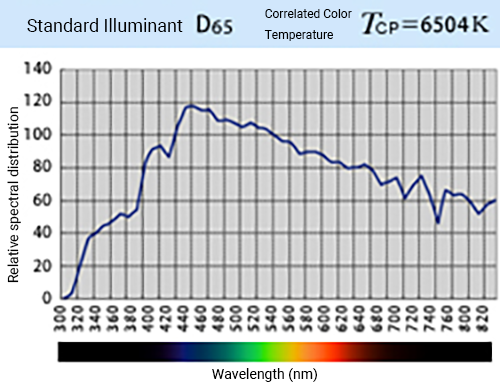 Illuminant D65 represents natural white light in the daytime based on the measurements of sunlight (daylight) on a sunny day, and the relative energy ratio for each wavelength is determined numerically. (Correlated color temperature Tcp = 6504 K ≪7≫)