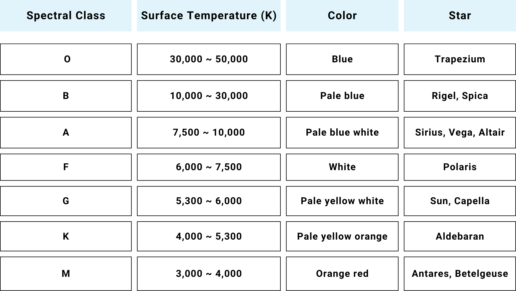 Stars cannot be strictly described as pure thermal radiation light sources, and the situation is complicated by factors such as absorption by intervening gas layers. However, it is generally thought that they follow similar principles, so their surface absolute temperature can be estimated from the correlated color temperature deduced from their color. The surface temperatures of various stars are thought to correlate with their approximate spectral type (spectral distribution) as shown in the above table.