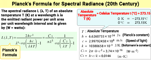 This research was conducted by the German physicist Max Planck, who derived a formula to describe the spectral distribution characteristics of electromagnetic waves emitted from a blackbody (Planck radiation law: see figure above). The significance of this formula is that once the absolute temperature T (in units of Kelvin, K) ≪1≫ of the blackbody is determined, the spectral distribution of the emitted electromagnetic waves is uniquely defined.