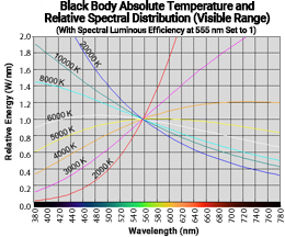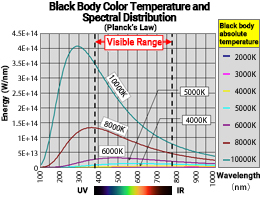 The graph on the right shows the spectral distribution curves at different absolute temperatures, based on Planck's radiation law. The higher the temperature, the more energy is emitted, and as the temperature decreases, the energy emitted decreases, and the peak wavelength shifts towards the longer wavelength side. Looking at the graph from the perspective of color, the graph's slope in the visible range (380 – 780 nm) is closely related to color.