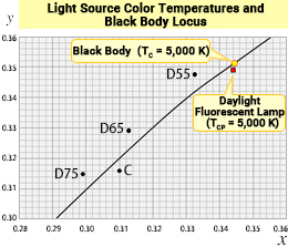 A blackbody is a theoretical construct, but what happens when we add the chromaticity of various real "white" light sources to this diagram? Generally, it is rare for the chromaticity points of these light sources to fall directly on the blackbody locus line. Most often, they appear close to either side of the locus. For example, the chromaticity of a daylight white fluorescent lamp would be plotted slightly below the blackbody locus point for TC = 5,000 K, around (x, y) = (0.344, 0.349).