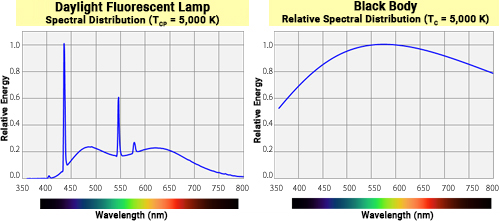 For example, the spectral distribution characteristics of fluorescent lamps are distinct from those of a blackbody, so their chromaticity coordinates generally do not fall directly on the blackbody locus. Instead, the absolute temperature of the lamp's electrodes most closely resembles the light emitted by a blackbody at 5,000 K.