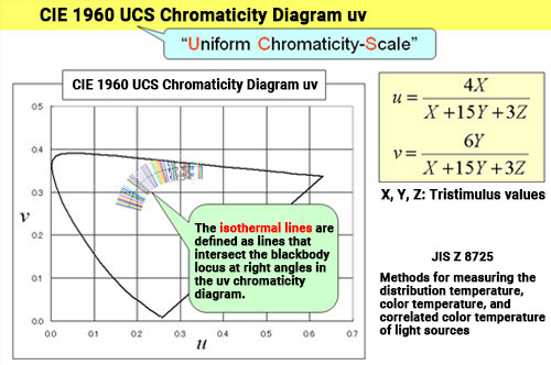 The "closeness" of a chromaticity point is evaluated using color difference, which we explained in the last chapter (Chapter 26). Correlated color temperature uses the CIE 1960 UCS chromaticity diagram (uv chromaticity diagram) (see Comment <<2>> in Chapter 26). If we draw lines from the light source's chromaticity point perpendicular to the blackbody locus, the line will intersect the locus at the point where the color temperature of the blackbody most closely matches the color of the light source. In other words, the correlated color temperature for all chromaticity points on this line corresponds to the color temperature value of the blackbody at this intersection. These lines are known as isotherms.