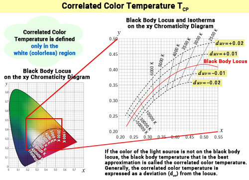 There are many types of "white light" around us that emit light based on principles different from those of a blackbody. By "borrowing" the color temperature value of the blackbody locus closest to the chromaticity point of the light source, we can represent the hue of the light source with just one number, even if it is less precise. This method is known as correlated color temperature (TCP).