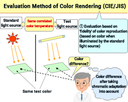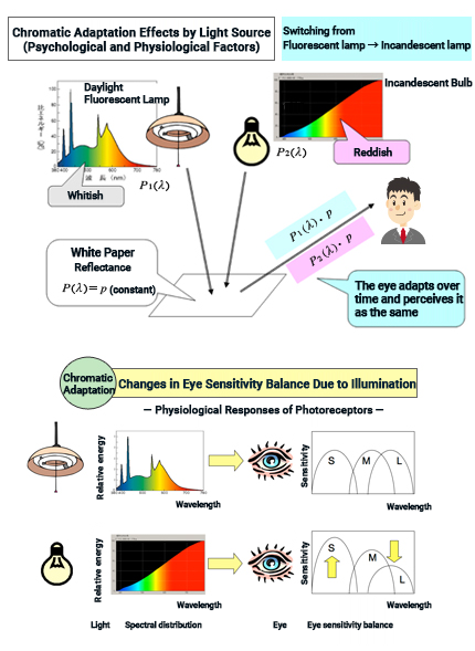 The way objects appear in color is primarily determined by a combination of the spectral distribution of the illuminating light and the physical properties of the object (spectral reflectance). However, actual perception is also physiologically and psychologically altered by vision properties. When considering the color rendering of lighting, we need to account for chromatic adaptation, ≪2≫ a factor directly related to the characteristics of the light source among the various factors affecting how colors appear due to visual characteristics.