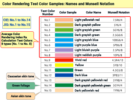 As indicated by the definitions above, the average color rendering index Ra represents the average fidelity of eight representative hues. It provides a general indicator of the overall color rendering quality. However, the color rendering index (Ri) must also be considered to assess the color rendering of specific hues.