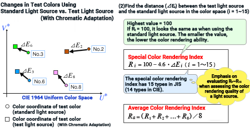 Aligning the CCT of the standard light source with that of the test light source ensures that the perceived color and psychological impressions are consistent, making accurate evaluations possible. The CRI evaluates the color difference that remains after compensating for the effects of chromatic adaptation.