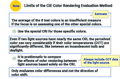 Though the CRI is widely used, it has several limitations, including issues in its calculation. ≪6≫ Various new evaluation methods were proposed to improve it, but as of 2015, a new standard has not been established.