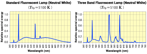 Efforts were made to improve the color rendering of fluorescent lamps, but there was a dilemma: improving color rendering often led to decreased energy efficiency while increasing energy efficiency led to poorer color rendering. This problem was solved with the development of three-band fluorescent lamps, which have sharp emission spectra in the red, green, and blue wavelength regions. By selecting emission spectra that matched the characteristics of the three types of cone cells in the human eye, these lamps greatly improved color rendering without sacrificing efficiency, ≪5≫ and also enhanced the clarity of color perception.
