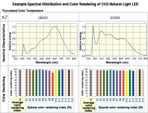 Recent advancements have led to white LEDs that span the entire visible spectrum. By combining different phosphors, these LEDs can be made in various correlated color temperatures and have smoother spectral distributions closer to standard light sources, significantly improving color rendering. For example, the "Natural light LED" manufactured by CCS achieves both a high average color rendering index (Ra) and above 90 for all special color rendering indices Ri across all test colors (i = 1 to 15).