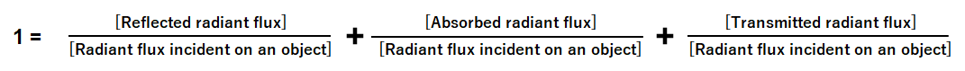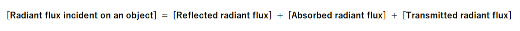 The relative proportions of reflection, absorption, and transmission depend on the material's atomic and molecular composition, the wavelength (frequency) of the incident light, and other conditions such as the angle of incidence and the object surface. For most materials (excluding fluorescent substances), this relationship holds true for each wavelength component of light. Thus, the equation for each wavelength λ is defined as follows:
