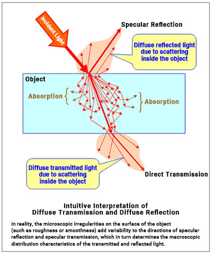 In the case of solids, photons that are not absorbed by the particles on the surface (such as atoms and molecules) of the material enter the interior and interact with other particles within. Short-wavelength photons are more likely to be scattered multiple times, causing their paths to change direction frequently and become more uniform in all directions. In contrast, longer-wavelength photons are less prone to scattering, which means their paths remain more consistent and straight. As a result, in thin materials, more long-wavelength photons can pass straight through (transmission), creating what is known as direct transmitted light. Photons that have their paths altered due to scattering but still exit on the opposite side of the material are seen as diffuse transmitted light. Both direct and diffuse transmitted light together form the observable transmitted light.