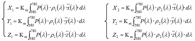 Consider two objects with spectral reflectance properties ρ1 (λ) and ρ2 (λ). When observed under a light source with a spectral distribution P (λ), the tristimulus values representing the colors of these objects, (X1, Y1, Z1) and (X2, Y2, Z2), can be expressed as: