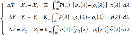 If (X1, Y1, Z1) = (X2, Y2, Z2), the objects are perceived as the same color. If not, the differences ΔX, ΔY, ΔZ represent the cause of the color difference: