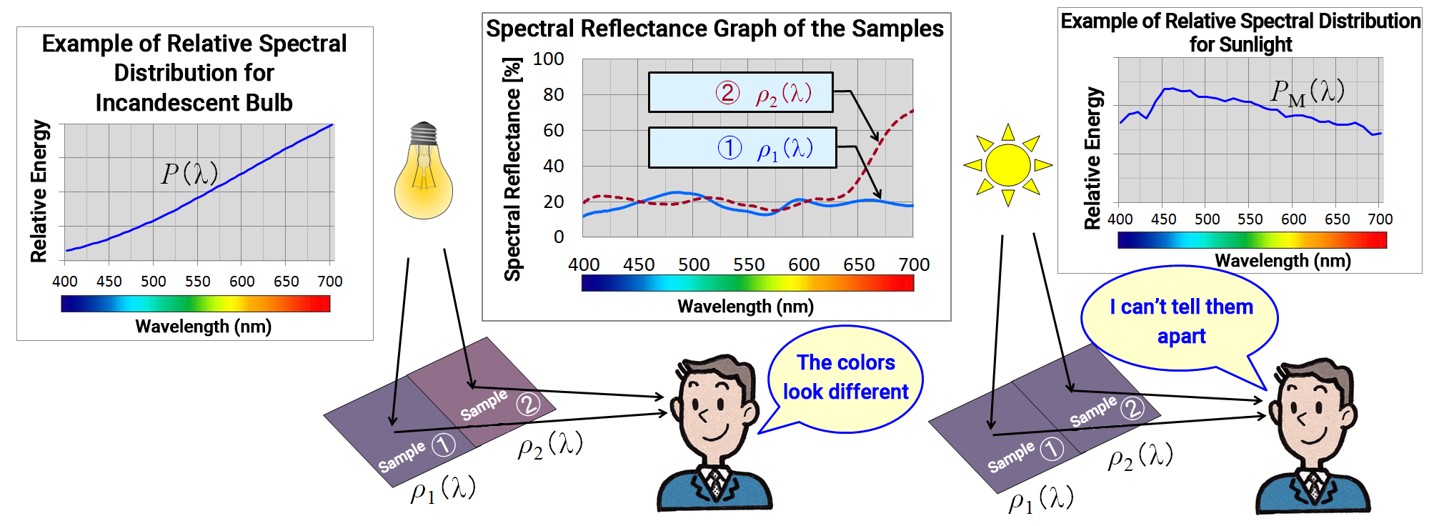 ・Variation in light source properties: If the characteristics of the illuminating light P(λ) differ, the same object will appear to have a different color.