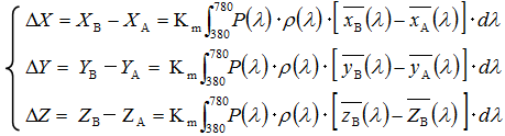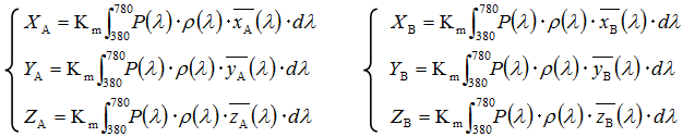 If the color-matching function of Observer A is xA(λ), yA(λ), zA(λ) and that of Observer B is xB(λ), yB(λ), zB(λ), the tristimulus values for their color perception, (XA, YA, ZA) and (XB, YB, ZB), can be expressed as: