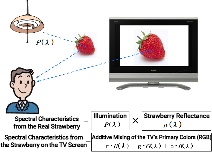 The spectral distribution of light entering the eye from an actual strawberry differs from that of a strawberry displayed on a TV or in a photograph. The strawberry on a TV screen is created through additive color mixing using the three primary colors of light: red (R), green (G), and blue (B). Meanwhile, the strawberry in a photograph is reproduced through subtractive color mixing using yellow (Y), magenta (M), and cyan (C). Although the spectral distributions of the actual strawberry and its reproductions differ, metamerism allows us to perceive them as identical colors. The ability to create a wide variety of colors using additive or subtractive color mixing is rooted in the principle of metamerism.