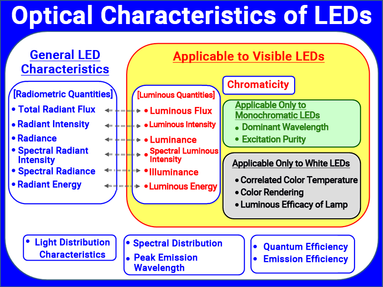 That said, "optical characteristics of LEDs" encompasses a lot, as shown on the right. Among these, the characteristics in the yellow box apply to all LEDs that emit light in the visible spectrum. Of those, the characteristics in the green box apply only to monochromatic LEDs, and those in the gray box are unique to white LEDs.