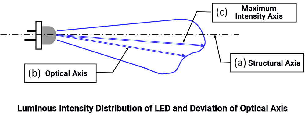 For traditional light sources like incandescent bulbs (which generally emit light evenly in all directions except at the base) or fluorescent lamps (which have a uniformly diffused emission from the tube surface), the light distribution is broad and smooth. In these cases, the three types of axes listed above usually align well. However, it is quite common for these three axes to be noticeably misaligned in the case of LEDs mounted in packages.