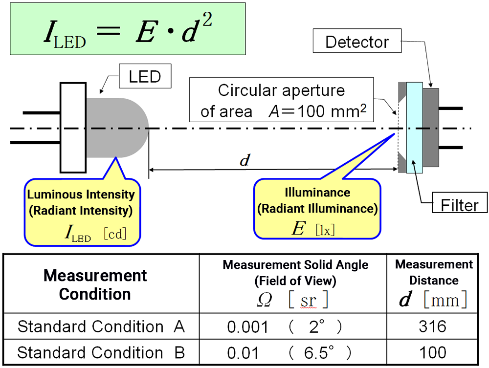 Luminous intensity is measured by using the illuminance E [lx] at a certain distance d [m] from the light source, based on the luminous flux φ [lm] emitted within the solid angle Ω [sr] which is determined by the detector's receiving area S [m2] and the distance d [m]: