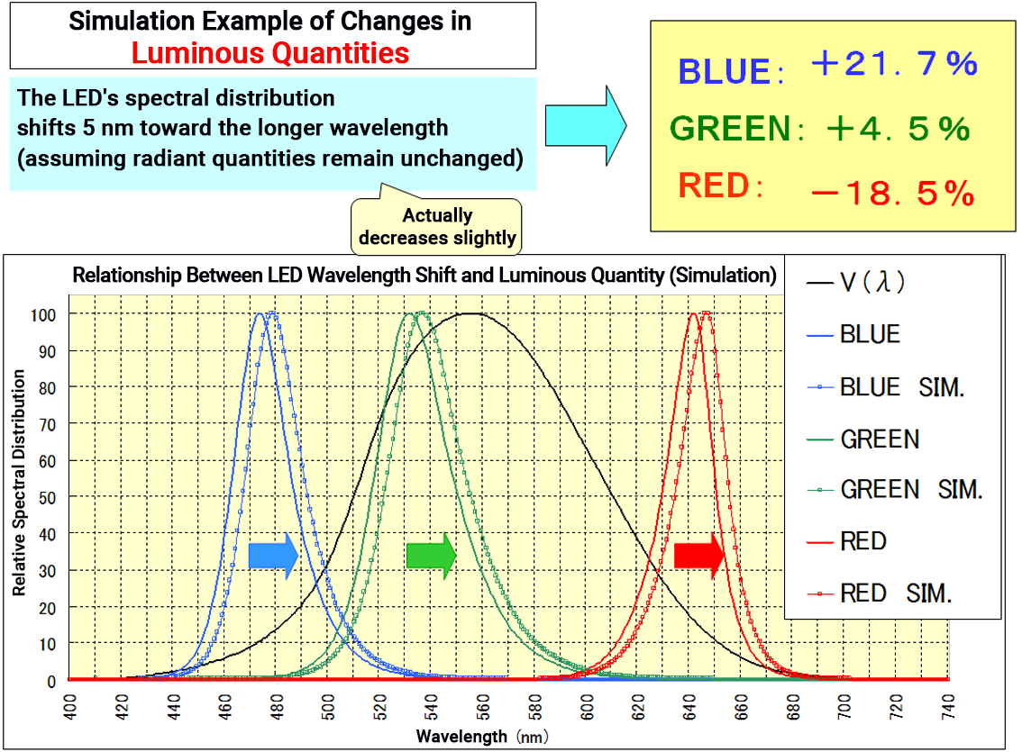 The figure below simulates changes in luminous quantities (i.e., perceived brightness) for three types of monochromatic LEDs (blue, green, and red), assuming a 5 nm redshift in emission wavelength caused by junction temperature rise immediately after powering on. Although actual heating would slightly lower total light output, this simulation assumes it stays constant to isolate the effect of wavelength shift. Since the emission wavelength ranges of blue and red LEDs fall in areas of the spectrum where the standard luminous efficiency curve V(λ) changes rapidly, a small shift greatly affects the measured brightness.