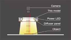 LEDs are embedded around a circular light-guiding diffusion plate. Uniform diffused light is radiated from a light-emitting surface arranged at an angle to the workpiece.