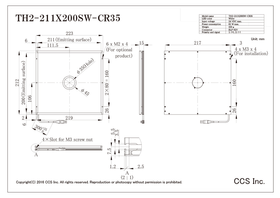 This Light Unit emits white light and measures 223 x 212 x 15 mm (width x depth x height).The light-emitting surface measures 211 x 200 mm.Camera-window type.