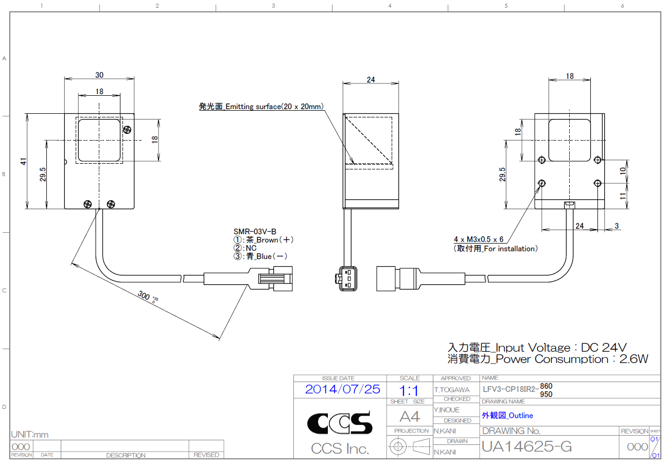 This Light Unit adopts LEDs with a peak wavelength of 950 nm and measures 30 x 41 x 24 mm (width x depth x height).